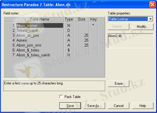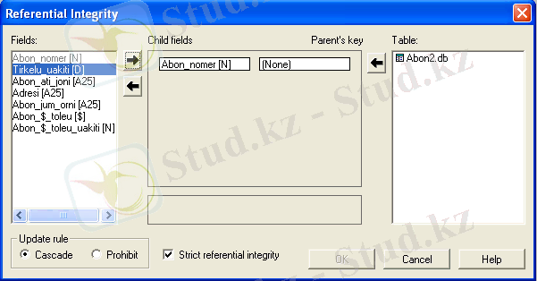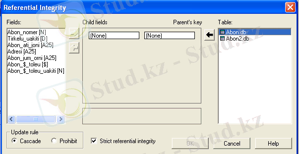 Abon2. db кестесін (элемент File менюі/Table/Open) ашып және кестені өзгерту құрлымы режіміне (Table/Restructure) кіреді. Table Properties түсетін тізімінде Refrential Integrity элементін таңдаймыз және Define пернесін басамыз. Көрінген диалогтық терезеде (сурет. 10) Fields тізімінде Abon2. db кестелерінің өрістері көрсетілген.