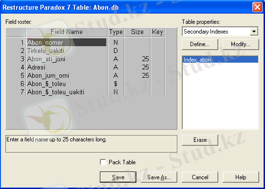 Abon2 (Save кнопкасын) кестесіндегі өзгерістерді сақтап, 1 (Table/ Restructure) кестесінің реструкизациясы режіміне қайта кіреміз. Table properties тізімінде Secondary Indexes элементін таңдаймыз индекстер тізімінде 2 атымен пайда болған жаңа индексті көреміз. Бұл индекс сілтегіш бүтіндік құрылған кезде автоматты түрде тұрғызылған (сурет 12) .