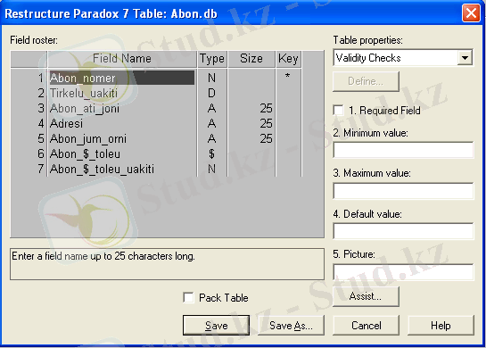 Мәліметтер базасының конструкциялау. Енді МБ-н кестеден тұтас конструкциялаймыз. Олардың құрлымы кестелерден тұрады. Есептің қойылымынан белгілі болғандай "Abon. db" және "Abon2. db" кестесі “бірдің-көпке” деген қатынасында, олай дейтініміз Abon. db кестесіндегі бір жазбаға Abon2. db кестесіндегі сол материалға бірнеше жазба сәйкес келеді. Байланыс өрісі болып 2 кестеде бар Abon_nomer өрісі болып табылады. Кесте мәліметтің бүтінділігін анықтайық .