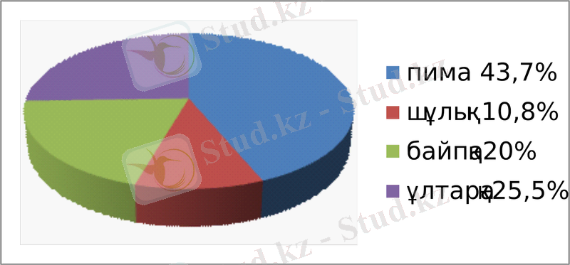 Көріп отырғанымыздай, тұтынушылардың басым көпшілігі пима алады, 43, 7пайыз, кейінгі орында ұлтарақ 25, 5 пайыз, байпақ 20 пайыз, шұлық 10, 8 пайыз. Бұл дегеніміз, киіз бұйымдарын жасау арқылы жақсы табыс табуға болатындығын көрсетеді.