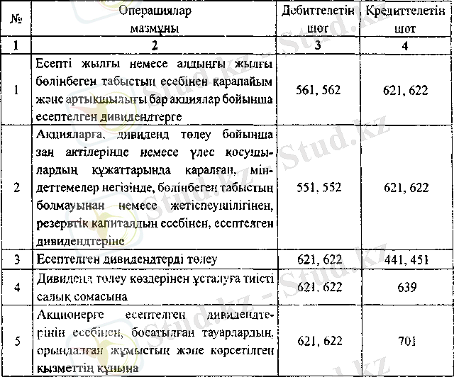 Д-т: «Қарапайым акциялар бойынша есеп айырысу» немесе «Артықшылыгы бар акциялар бойынша есеп айырысу» деп аталатын шотгардың тиістілері;
