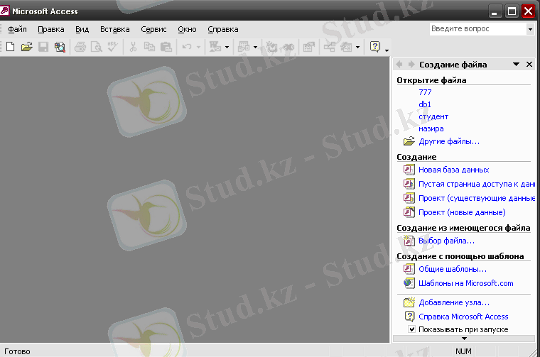 Ең бірінші Access-ті іске қосу үшін Іске қосу→Программалар→Microsoft Access командасын береміз. Осы командадан кейін мына терезе ашылады(1-сурет) .