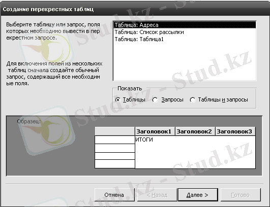 3. Айқыш сұраныс - берілген кесте немесе сұраныс негізінде қорытынды мәндерді есептеуге арналған кесте. Оның әрбір қатарына және бағанына атау беріледі де олардың қиылысуында қорытынды мәнлер жазылады.