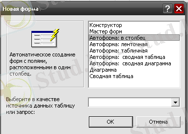 Кестенің стандартты түрдегі формасын құру үшін Жаңа форма терезесінде автоформалардың бірін белгілеп және терезенің төменгі жағында кесте атауын таңдап, ОК туймесін шертіңіз.