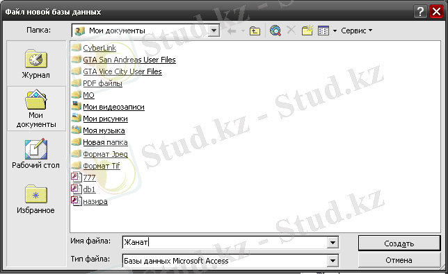 Бұл терезе арқылы өз атымызбен жаңа файл аша аламыз. Ол үшін Новая база данных - ты тышқан көмегімен бір шертіп, содан кейін файлға ат береміз.