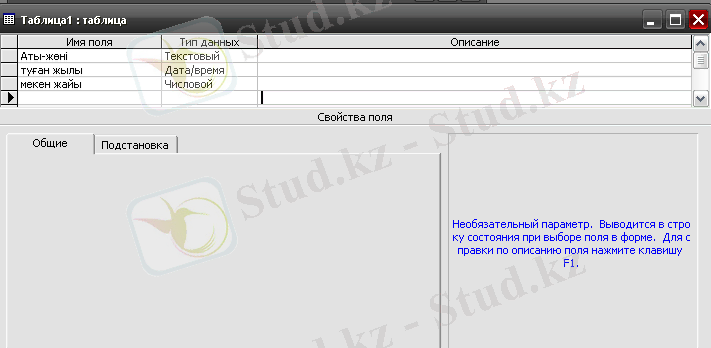 Констуктор режимі . Бұл режимді Жаңа кесте терезесінде Конструктор тәсілін белгілеп, ок туймесін басамыз. Бұл терезеде кесте құрылымын құрастырушы өзі анықтайды.