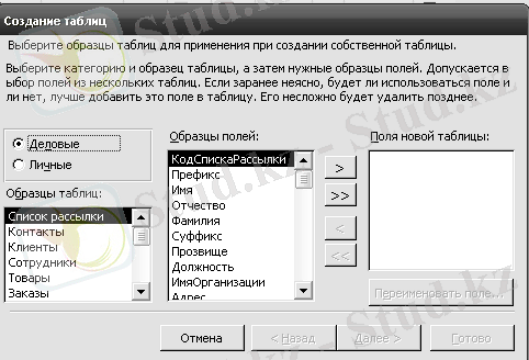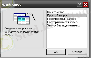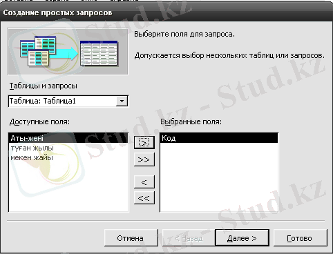 1. Қарапайым сұраныс - кестеден таңдалған өрістер бойынша құрылатын нәтижелік кесте. Жаңа сұраныс терезесінде оның Қарапайым сұраныс түрін таңдап, ОК түймесін шерткенде Қарапайым сұраныс шебері іске қосылады. Бұл терезеде шебердің бірінші терезесі ашылады ды, сұраныс жасалатын қажетті кестелер мен олардың қажетті өрістері таңдалады.