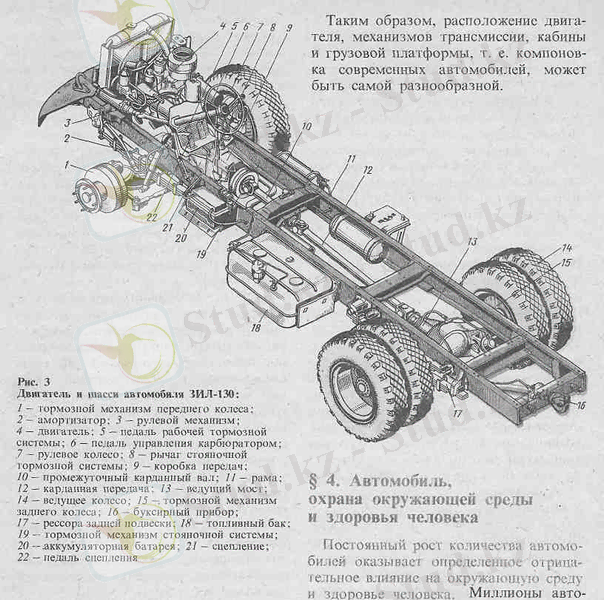 1 - алдыңғы дөңгелектің тежеуіш механизмі; 2 - амортизатор; 3 - рульдік механизм; 4 - қозғалтқыш; 5 - жұмыс тежеуіш жүйесінің басқышы; 6 - карбюраторды басқарудағы басқышы; 7 - рульдік дөңгелек; 8 - тежеуіш жүйесіндегі тұрақты рычагы; 9 - беріліс қорабы; 10 - аралық карданды білік; 11 - рама; 12 - кардан берілісі; 13 - жетекші мост; 14 - жетекші дөңгелек; 15 - артқы дөңгелектің тежеуіш механизмі; 16 - тіркеу құралы; 17 - артқы асқыш рессоры; 18 - отын білігі; 19 - тежеуіш механизмінің тұрақты жүйесі; 20 - аккумуляторлы батарея; 21 - ілініс; 22 - ілініс педалі.