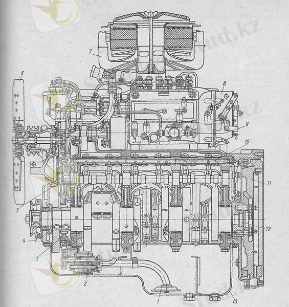 1 - май қабылдағыш; 2 - май насосы; 3 - газ таратқыш шестернясы; 4 - шкив; 5 - таратқыш білік; 6 - желдеткіш; 7 - ауа сүзгісі; 8 - жоғарғы қысымды отын насосы; 9 - отыншығарғыш насос; 10 - итеру осі; 11 - маховик; 12 - иінді білік; 13 - картер түбі