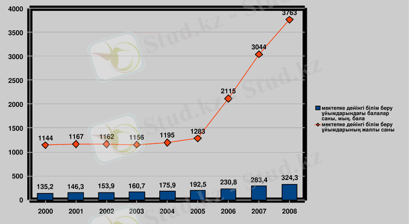 Орын алған бала-бақшалар санының төмендеу үрдісіне 2000 жылы түбегейлі өзгеріс жасалды. Қазіргі уақытта мектепке дейінгі білім беру ұйымдарының саны жыл сайын өсуде. Соңғы жылдары республикамызда мектепке дейінгі білім беру ұйымдарындағы тәрбиеленушілер санының өсуі байқалуда. 2008 жылы 1 қазанда ол 2000 жылғы 133, 2 мың балаға қарағанда 324, 3 мың баланы құрап отыр.