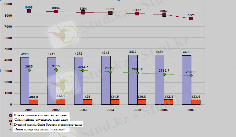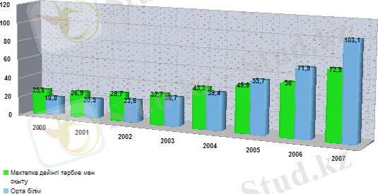 Соңғы жылдары Қазақстанда оң үрдіс байқалуда - мемлекеттік бюджеттен білім беру жүйесін қаржыландырудың абсолюттік мәнде едәуір өсуі. Егер 2000 жылы бір оқушыға мектепке дейінгі тәрбиелеу мен оқыту шығындары 25, 8 мың теңгені құраса, онда 2007 жылы - 72, 8 мың теңге, ал орта білім алатын бір оқушыға шығын 18, 8-ден 103, 1 мың теңгеге дейін құрап отыр.