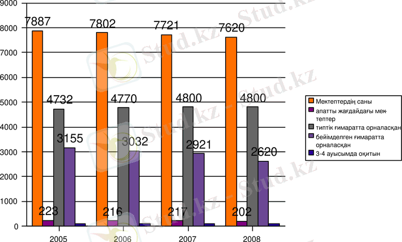 Қазіргі жалпы білім беретін мектептер базасының материалдық-техникалық жай-күйі қазіргі заманның талаптарға әлі де жауап бере алмай отыр: жалпы саны 7620 мектептің 63, 0 %-ы типтік ғимараттарда, 37, 0 %-ы бейімделген, 202 мектеп авариялық жағдайда тұр. Мектептің 22, 7 %-ы күрделі жөндеуді қажет етеді. Мектепің 86, 0 %-ы 1990 жылға дейін салынған. Мектептің 65, 1 %-ы екі, ал 86-і үш ауысымда жұмыс істейді. Еліміздің өңірлерінде білім берудің бюджетін қалыптастыру кезінде мектептердің оқу-материалдық базасының мазмұны мен дамуына қажеттілігі іс жүзінде дұрыс есепке алынбайды, нәтижесінде авариялық жағдайда тұрған мектептердің саны азаймай отыр. Ауылдық мектептердің көпшілігі бейімделген ғимараттарда орналасқан. Республикамызда 2000 - 2007 жылдары бұл үлес өзгермей отыр және 2008 жылда ол мектептердің жалпы санының 37, 0 %-ын құрап отыр.
