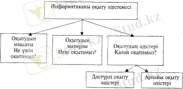 Информатиканы оқыту әдістемесі оқытудың мақсатын, мазмұнын, әдісін, құралдарын, формаларын, тапсырмалар жиынтығын біртұтас жүйе ретінде қарастырады (2-схема) .