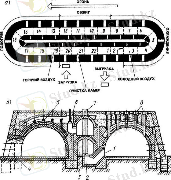 Сур. 1. Сақиналы пештің қимасы(б) мен жұмыс істеу схемасы(а) 1- түтінді очелкалар; 2 - түтінді конус; 3 - түтінді канал; 4 - жүрісжол; 5 - себу қатары; 6 - себу қатарының қалпақшасы; 7 - қарнақ; 8 - отын құбырлары .
