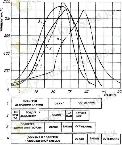 Сур. 2. Сақиналы пештегі күю тәртібі. 1 - кәдімгі ( П. А; Дуванов бойынша) ; 2- кеуекті кірпішке ; 3 - таспен араласқан ; 4 -ылғалдылығы жоғары шикізаттарға.