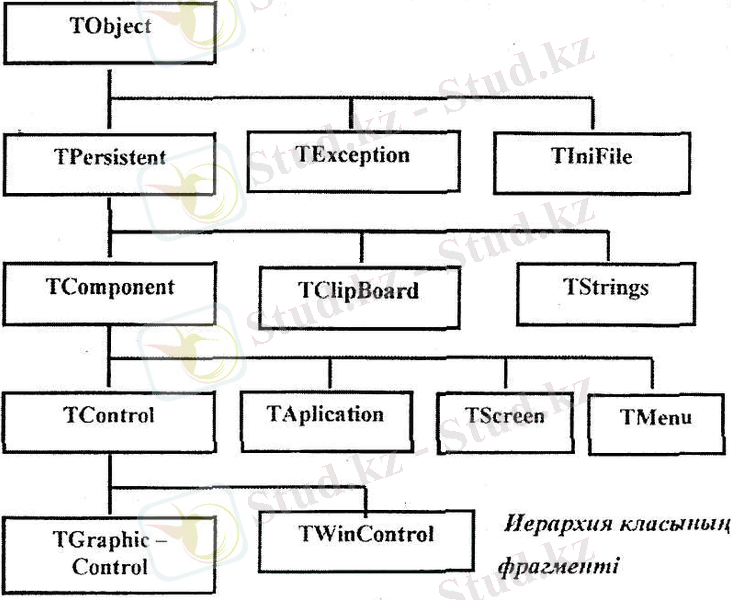 TComponent класы - барлық компоненттерге негіз; өзінің атасының әдісіне қосымша болып, оның басқа компоненттеріне ие болатын құралдарды қамтамасыз етеді. Формаға кез келген компонентті орналастыру нәтижесінде, ол басқа компонентке тиісті болады (негізінен формата) . Компонента құру барысында, ол оған тиісті компоненттерді автоматты түрде құрылуын қамтамасыз етеді, ал оны жою барысын оған тиісті барлық компоненттер автоматты түрде жойылады.
