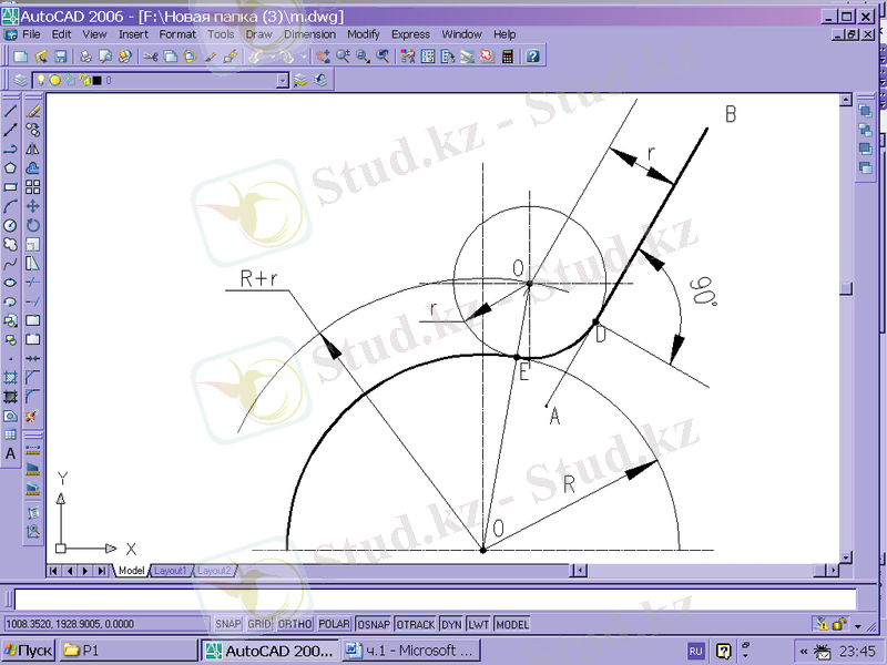 1) түйіндесу центрін табамыз, шеңбер доғаларының R1 + R радиустарымен қиылысу О нүктесін және R2+ R радиустарымен шеңбердің шоғырланымы R1 және R2 радиустарымен сәйкес деп есептеледі;