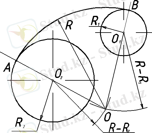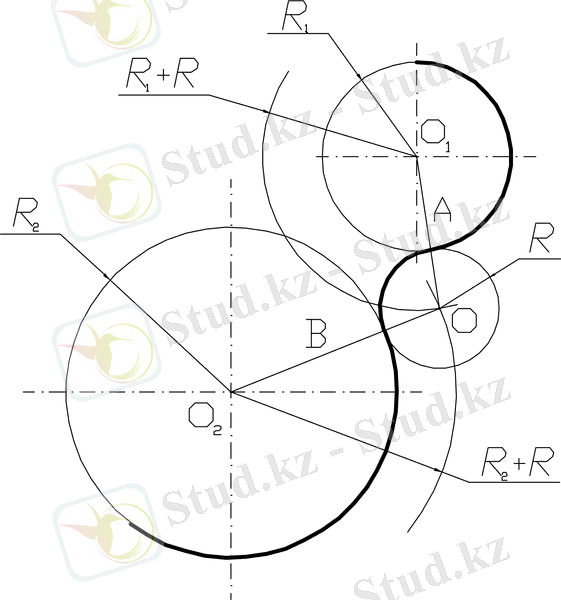 1) түйіндесу центрін табамыз, шеңбердің доғаларының R1 + R радиустарымен қиылысу О нүктесін және R2+ R радиустарымен шеңбердің шоғырланымы R1 және R2 радиустарымен сәйкес деп есептеледі;
