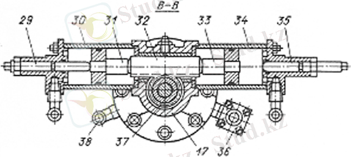 Сығылған ауаны жұмыс орнының бір цилиндіріне, мысалға сол жаққа берсе рейкалы 32 поршен 31 оңға қозғалады, айналыммға шестернаны 37, валды 14, 11, фланецты 4 қысқышпен бекітілген қозғалтады. Оң жақ цилиндр жазықтығына атмосферамен хабарлайды.