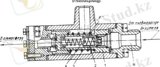 Одан ары қысым жоғарылауына байланысты клапан 2 ашылады, пружинаны 4 қысу арқылы және ауа золотник және “P” бөлік қатары аумағы арқылы пневмоцилиндрдің “N” бөліктің сығылу ауаның әрекеті арқылы атмосферамен бірігуі поршенді аумақта орналасқан пружиналар 3, 4; золотник 1 жәнре клапан 2 шығыс жағдайға қайта оралады. Бұл кезде поршенді аумақтағы ауа атмосфераға шығады.
