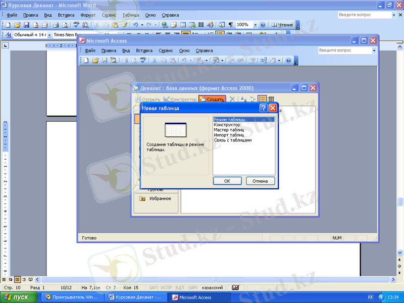 Кесте - деректер қорының негізгі объектісі. Кесте құру үшін ДҚ терезесін ашып, Кестелер - Құру командасын беру керек (кестелер қондырмасын, одан әрі Құру батырмасын шерту) . Жаңа кесте сұхбаттық терезесі көрінеді (1 - сурет) . Онда кесте құрудың үш режимі бар:
