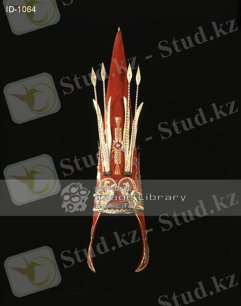 Бас киім 150-ге жуық әшекей заттармен безендірілген. Биік, шошақ төбелі, ұзындығы 70см шамасындағы бас киімі әшекейлердің орналасуына байланысты үш бөліктен тұрады: көк әлемі, жер әлемі және жер асты әлемі. Арқардың алтын статуэткасы бас киімнің ең ұшында орналасқан. Ол таудың мәңгілік қар-мұз басқан шың құздарын мекендеуші жануар тәңірге бір табан жақын, «кіршіксіз» деп есептелген. Әсемдікті көрсетіп тұрған жан-жағындағы төрт жебе, әлемнің төрт жағын бейнелейді. Олар сабы жіңішке алтын лентамен спираль сияқтандырып оралған және жоғары жағы жапырақ тәрізденіп, ортасы қуыс болып келген. Бұл бас киімдегі жебе тәрізді әшекейлер әлемнің төрт жағын бейнелейді. Ал құстың қанаттары жоғарғы билікті, жоғарғы әлемді білдіреді.