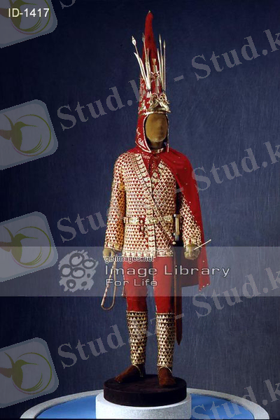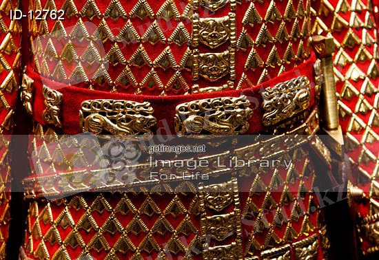 Қысқа қамзол - құрастырмалы ауыр белбеумен буылған. Белбеуге аңға ұқсас бейнелер, сонымен қатар 16 тоға бұғы бейнесінде жапсырылған. Белдікті безендірген шығыршық және алтын белдік бас. Оған барыс бейнесі және иіріліп жатқан қасқырды бейнелеген. Қасқыр мен барыс басқа әлемді бейнелейтін және жендеттік жасайтын жыртқыш болып есептеледі. Сондықтан да жауынгер идеалын кейіптейтін қасқыр образы ер жүректіліктің, тәкаппарлықтың, еркіндіктің және патша тұқымының нышаны ретінде саналған. Шексіз даланың жауынгерлері өздері қасқырға «еліктей» отырып, олардың сарбазға қажетті қасиеттерін «бойына жұқтырып», өздерін «қасқыр», «барыс» түрінде сезінетін болған.