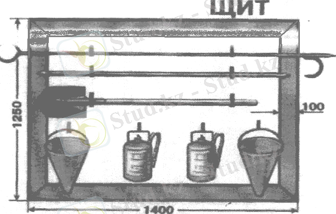 - өрттік щит (Сурет . ) : күрек, балта, лом, екі шелек, екі өрт сөндіргіш. Өрттік щит, қоймаларда, өндірістік орталарда, механизацияланбаған инструменттер мен өрттік инвентарларды орнатуға арналған. Ол, ППБ 01-03 бойынша комплектеледі.