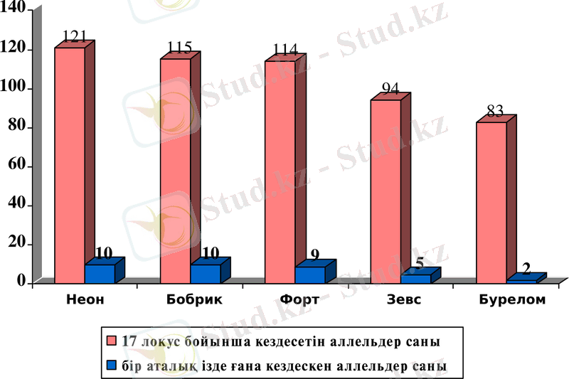 Дүние жүзі бойынша қазіргі таңда белгілі 17 локус бойынша аллельдердің саны 194 болса, ал қостанай жылқы тұқымының аталық іздеріне жүргізілген зерттеу жұмыстарында соның 163 аллелі кездесті, оның ішінде ең кең аллельдердің таралу спектрі Неон аталық ізінде (жалпы кездесетін аллель саны 121 және осы аталық ізде ғана кездесетін аллель саны 10), орташа көрсеткішті Бобрик (жалпы кездесетін аллель саны 115 және осы аталық ізде ғана кездесетін аллель саны 10) және Форт (жалпы кездесетін аллель саны 114 және осы аталық іздерде ғана кездесетін аллель саны 9) аталық іздері көрсетті. Ал Зевс (жалпы кездесетін аллель саны 94 және осы аталық ізде ғана кездесетін аллель саны 5) және Бурелом (жалпы кездесетін аллель саны 83 және осы аталық ізде ғана кездесетін аллель саны 2) аталық іздері басқа аталық іздердің аллельдерінің көрсеткіштерінен төмен екенін 1 диаграммадан анық байқауға болады.