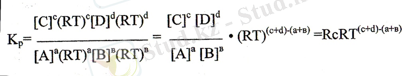 немесе, Кр=Кс(RТ) Δn мұнда, n=(с+d) -(а+b), яғни Δn реакциядағы заттардың стехиометриялық коэффициенттердің алгебралық қосындысы, немесе реакциядағы молекула санының (көлемінің) өзгерісін көрсетеді. Молекулалар сандары өзгермейтін реакциялар үшін, яғни с+д=а+в жағдайда, Кс және Кр мәндері өзара сәйкес келеді, Кр= Кс.