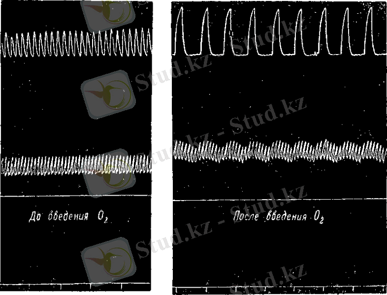 1-ші сүрет. Оттегін терінің астына жібергенге дейін және жібергеннен кейін қанның қысымы (төменгі қисық сызық) мен дем алыстың (жоғарғы қисық сызық) өзгеруі (Мицов) .