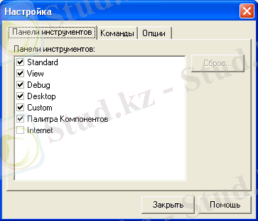Бұл Delphi ортасының негізгі терезесі болып бірінші жолда мәзір орналасқан болып және саймандар тақтасы бар: Стандарт, Вид, Откладка, Палитра пользователя, панель компонентов, рабочая область Инструменттар панелін жөндеу терезесі: (2 сурет)