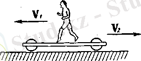 37-сурет. Адам арбаның үстімен сүйеніп, екі шардың серпімсіз v 1 жылдамдықпен жүгірсе, арба оған қарама - қарсы жаққа қарай v 2 жылдамдықпен шегінеді.