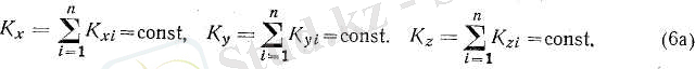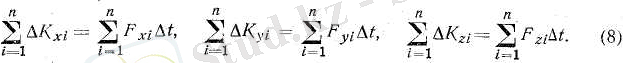 Қорытқы вектордың бір бағытқа түсірілген проекциясы (38-сурет) сол бағытқа түсірілген қосылғыш векторлардың проекцияларының қосындысына тең болғандықтан, (7) тендіктен мынадай қорытынды шығады: система түзген денелердің қозғалыс мөлшелерінің кез келген бағытқа түсірілген проекцияларының қосындысының өзгерісі, сыртқы күштер импульстарының сол бағытқа түсірілген проекцияларының қосындысымен анықталады. Егер сондай бағыттар регінде түзу сызықты тік бұрышты координаталар системасының ОХ, ОҮ және OZ осьтері алынса, онда п денелерден түзілген система үшін мына формулалар шығады: