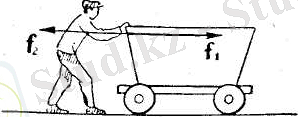 36-сурет. Адам вагонетканы f 1 күшімен итереді, сонда сан жағынан f 1 күшіне тең, бірақ адамның қолына қарама-қарсы жаққа қарай бағытталған f 2 күші әсер етеді.