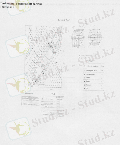 - Жобаланғаннан басқа 3-4 ғимараттарды бейнелеумен А форматындағы (420x594 мм) жеке парақта түсірілген түрлі-түсті шаймасы бар учаскенің, жолдардың, жаяу адамдар жүретін жолдардың, көгалдандырылған аймақтың және т. б. бас жоспары, М 1:500, 1:1000.