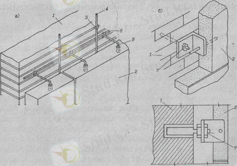 а - қаптау және қабырға аралығына ерітінді толтырып; б - сондай, толтырмай; 1 - қапталатын қабырға; 2 - қаптау тақтайшасы; 3 - ілгек; 4 - тік шыбық; 5 - ілмек; 6 - көлденең шыбық; 7 - бұрыштама бекіткіш