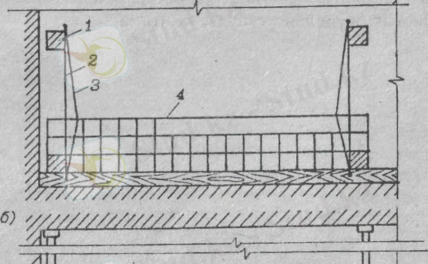 а - маяктар мен баулар бойынша; б - қатарлағыш пен баулар бойынша; 1 - маяк тақтайшасы; 2 - тік бау; 3 - жіп; 4 - көлденең бау; 5 - қатарлағыш