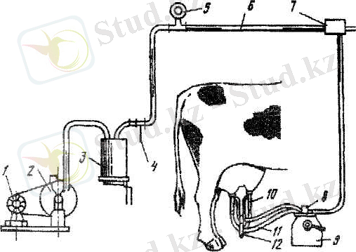 Белгіленуі:1- электрқозғалтқыш, 2 - вакуум-сорап, 3 - вакуум баллон, 4 вакуум реттегіш, 5 - вакуумметр, 6 - вакуум түтік, 7 - сауын шүмегі, 8 - пульсатор, 9 - сауу шелегі, 10 - сауу стаканы, 11 - сүт шлангасы, 12 - коллектор.