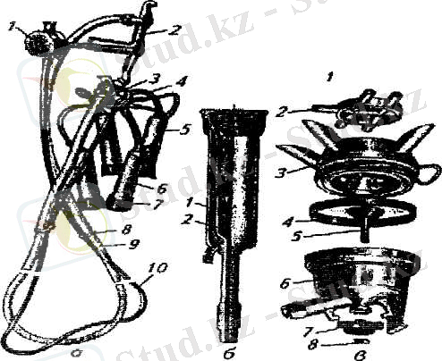 Белгіленуі:a - сүт құбырына cаyyғa арналған аппараттың жалпы көрінісі: 1 - пульсатор, 2 - ұстағыш, 3 - коллектор, 4 - сүт түтігі, 5 - түтік, 6 - стакан гильзасы, 7 - copy резеңкесі, 8 - сақина, 9 - сүт шлангасы, 10 - айнымалы вакуум шлангасы, б - сауу стаканы: 1 - гильза, 2 - copy резеңкесі, в - коллектор бөлшектері: 1 - бұрама, 2 - таратқыш, 3, 6 - жоғарғы және төменгі корпустар, 4 - аралық төсем, 5 - клапан, 7 - тығырық, 8 - шплинт.