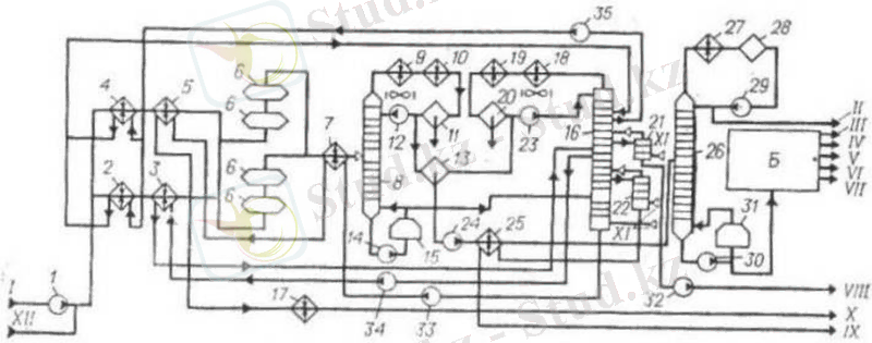 1, 12, 14, 23, 24, 29, 40, 32-35 -насостар; 2-5, 7, 25 - жылуалмастырғыштар; 6- электродегидраторлар; 8, 16, 21, 22, 26 - колонналар; 9, 10, 18, 19, 27 - конденсатор- тоңазытқыштар; 11, 13, 20 - сыйымдылықтар; 15, 31 - құбырлы пештер; 17 - тоңазытқыш; В - бензинді екіншілік айдау торабы; I-мұнай; II тұрақтандыру басы; III-қ. б. -62°С фракциясы; IV-62-85°С фракциясы; V-85 105°С фракциясы; VI-105-140°С фракциясы; VII-140-185°С фракциясы; VIII- 180-230°С фракция; IX-230-350°С фракция; X-350°С-ден жоғары фракция; XI-су буы; XII-деэмульгатор.