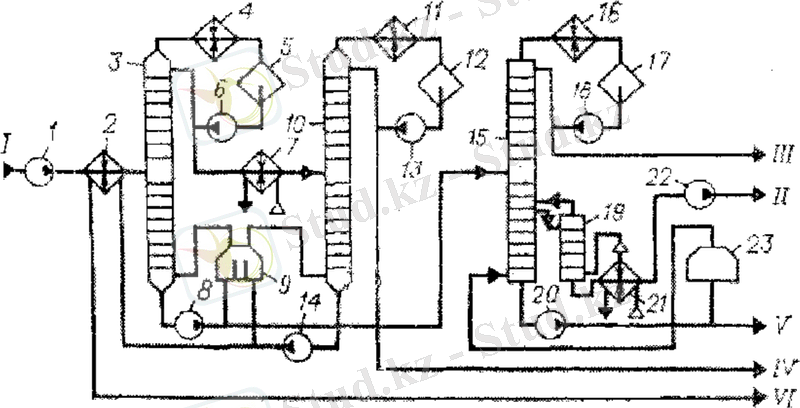 7-буқыздырғыш; 9, 23-құбырлы пештер; 21-қайнатқыш; I-қ. б-180°С фракция; II 105-140°с фракциясы; III-85-105°С фракциясы; IV-қ. б-62°С фракциясы; V- 140-180°С фракциясы; VI-62-85°С фракциясы.