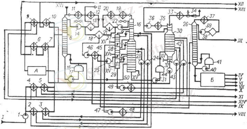 1, 14, 17, 22-25, 31, 36, 39, 40, 42-44, 46, 47, 49 - насостар; 2-7, 9, 10, 45 - жылуалмастырғыштар; 8, 16, 25-30 -колонналар; 11, 12, 19, 20, 33, 37-конденсатор-тоңазытқыштар; 13, 18, 21, 38 -сыйымдылықтар; 15, 32, 41 -құбырлы пештер; 34-эжектор; 35, 48, 50-тоңазытқыштар; А-электродегидраторлар торабы; Б-бензинді екіншілік айдау торабы; I-мұнай; II-газ; III-тұрақтандыру басы; IV-VII-жеке бензин фракциялары; VIII-180-230°С фракция; IX-230-280°С фракция; X-280-350°С фракция; XI-350-500°С фракция; XII-гудрон (500°С-ден жоғары фракция) ; XIII-350°С-ден төмен фракция; XIV-400°С-ден жоғары фракция; XV-су буы; XVI- коррозия ингибиторы.