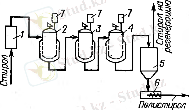 Осы әдіс бойынша (2 сур. ) стиролды немесе стиролдағы каучук ерітіндісін дозалау насоспен үздіксіз жылуаламстырғышқа 1 жібереді, онда ол 80-100 0 С дейін қыздырылып, реакторға 2 түседі, одан кейін насостар көмегімен реакторларға 3 және 4 бағытталады. Реакторлар бұл қышқылға төзімді, көлемдері 15-20 м 3 , қоршаулар, араластырғыштар және кері тоңазытқыштармен жабдықталған аппараттар 7.