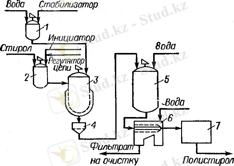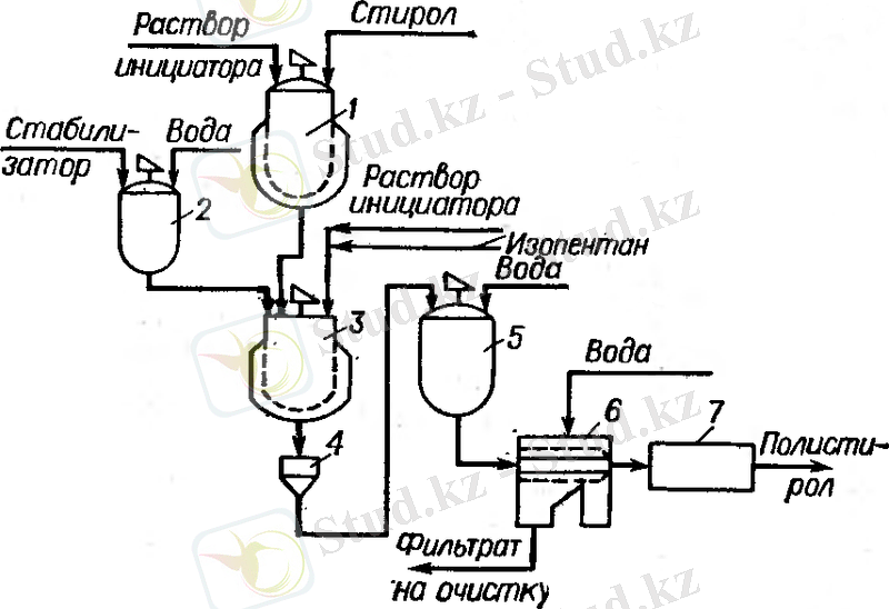 Реакторда 1 стиролдың алдын ала блок полимерленуі жүреді. Полимерлену 80-85 0 С инициатор - бензоил тотығы қатысында 30-40% конвесияға дейін жүреді. Содан сон форполимерді автоклавка 3 құйып, алдын ала енгізілген стабилизатордың сулы ерітіндісімен араластырады. Автоклавка стиролдағы инициатор ерітіндісінің жаңа порциясын және газтүзуші ретінде полистирол көбіктенуінде қолданылатын изопентан ерітіндісін құяды. Алынған суспензияны 90 0 С және 7-9 сағат бойы араластырады. Дайын полимер суспензиясын елеуіш 4 арқылы аралық ыдысқа 5 құйып, сумен сұйылтады және центрифугаға 6 жібереді, мұнда полимердің сығылуы мен шаюы өтеді. Ылғалды түйіршіктерін ауа кептіргішіне 7 жіберіп 40 0 С кептіреді.
