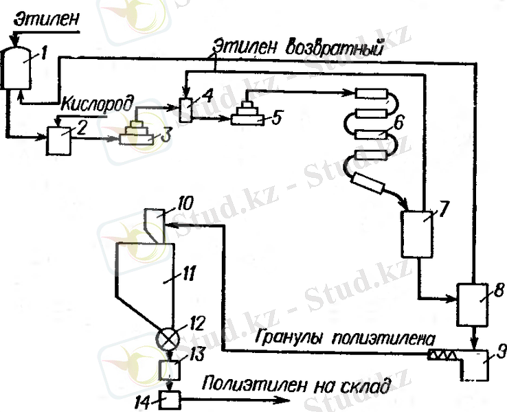 1-сурет. Жоғары қысымда этилен полимерленуінің сызбанұсқасы: 1 - этилен қоймасы, 2, 4 - араластырғыш, 3- бірінші каскад компрессоры, 5 - екінші каскад компрессоры, 6 - түтікше реактор, 7 - жоғары қысымды бөлгіш, 8 - төмен қысымды бөлгіш, 9 - экструдер-гранулятор, 10 - циклон, 11 - бункер, 12 - дозатор, 13 - таразы, 14 - қап тігетін машина