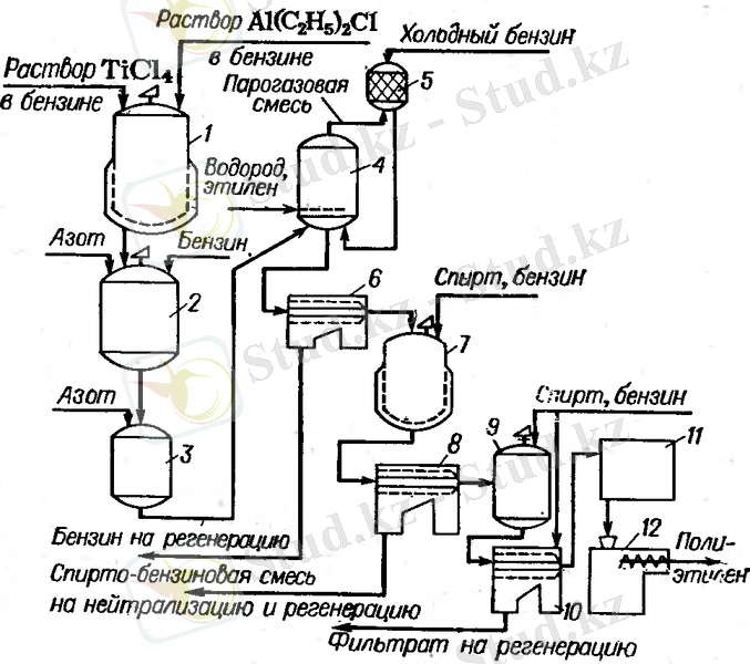 Төмен қысымда этиленнің үздіксіз полимерлену процессін схема бойынша (2 сурет) жүргізеді.