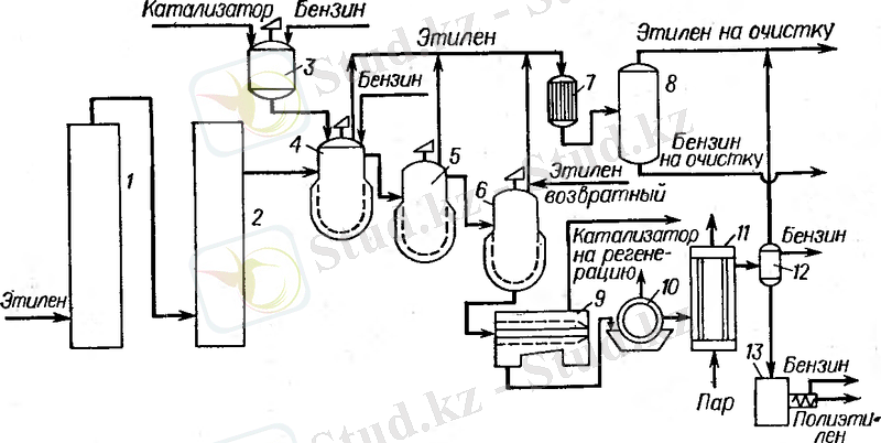 1, 2 - этиленді тазарту колонналары, 3-араластырғыш, 4, 5, 6 - полимеризаторлар, 7-тоңазытқыш, 8, 12-сепараторлар, 9-центрифуга, 10-фильтр, 11-концентратор, 13-экструдер-гранулятор