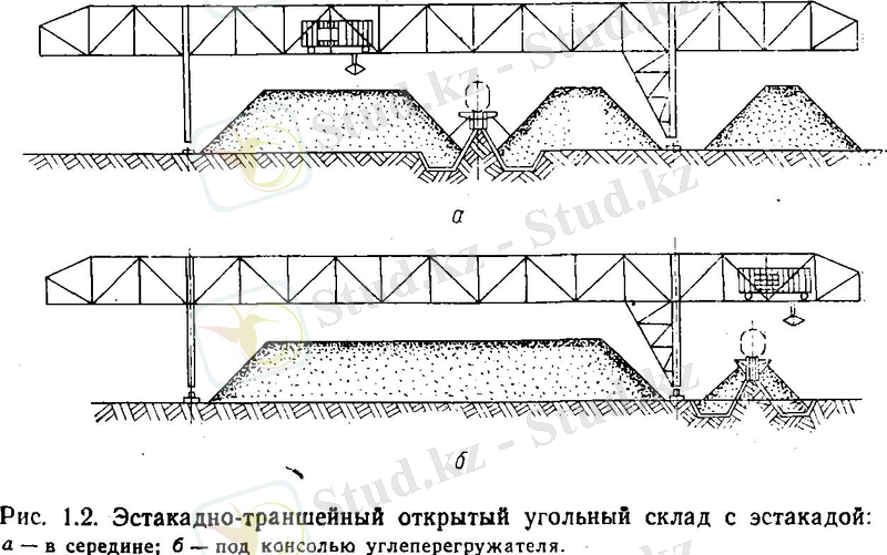 Эстакадалық траншеялық қоймада отынды түсіру қойманың ұзын бойындағы траншеяның үстінде орналасқан эстакадада қолмен жүзеге асырылады. Эстакада көпірлі қайтатиегіштің аралығының астына ортасында (а) немесе оның консольінің астына (б) (сурет 1. 2) орналастырылады.