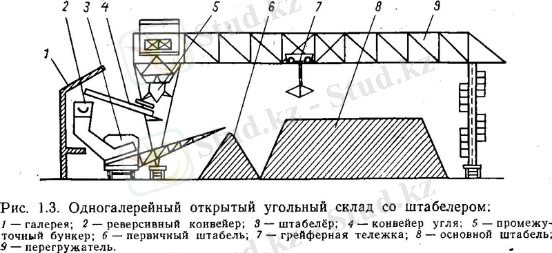 Көмір галереяның 1 конвейерлерінен түсіруші арбашалардың 3 көмегімен галерея терезелері арқылы біріншілік штабельге 4 түсіріледі. Әртүрлі маркалы көмірлерге бөлін-ген галереяның телімдері темірбетондық бөлгіштермен 5 бөлінген, ол біріншілік штабельдердің массасын ұлғайтуға мүмкіндік беріп, әртүрлі маркалы көмірлердің араласуын болғызбайды.